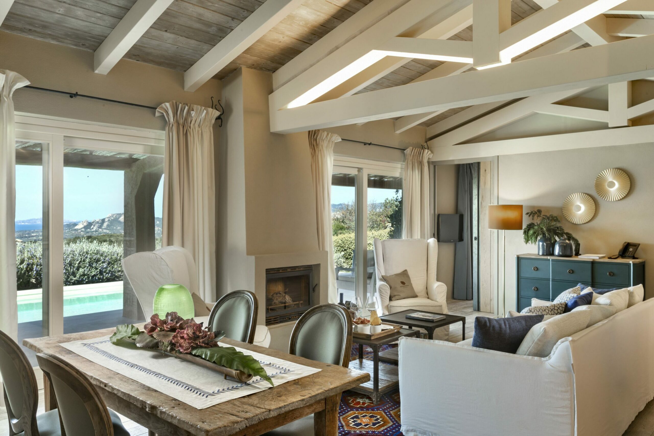 Les chambres et suites, chacune unique, offrent des espaces lumineux et confortables, avec une attention méticuleuse portée aux détails. Certaines disposent de piscines privées et de terrasses offrant des vues à couper le souffle sur la mer ou les montagnes.