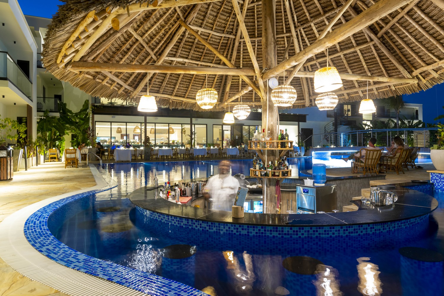 Des espaces bars complètent l’offre de restauration, soit pour un moment de calme en intérieur soir au bar piscine afin de siroter un cocktail tout en flottant dans l’eau.